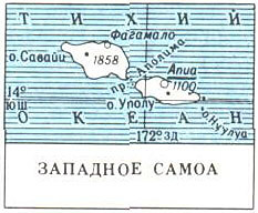 ЗАПАДНОЕ САМОА, государство в Океании, в юго-зап. части Тихого океана. Занимает зап. часть архипелага Самоа - острова Савайи и Уполу (почти 100% территории). Общая пл. 2,8 тыс. км2. Население 167 тыс. чел., в осн. самоанцы. Офиц. языки - самоанский и английский. Ок. 75% верующих - протестанты. Входит в Содружество. Западное Самоа - монархия, возглавляется пожизненным главой государства. Согласно конституции Западного Самоа, после смерти нынешнего главы государства монархия будет ликвидирована. Законодательный орган - Законодательное собрание. Столица - Апиа. Адм.-терр. деление: 11 округов. Денежная единица - тала.
