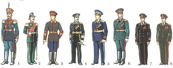 Звавия воинские: 1 - генерал от инфантерии, 1913; 2 - адмирал Российского флота в звании генерал-адъютанта, 1899; 3 - Маршал Советского Союза, 1940; 4 - адмирал ВМФ СССР, 1969; 5 - маршал авиации, с 1970; 6 - генерал-лейтенант Вооружённых Сил СССР, 1969; 7 - генерал-лейтенант сухопутных войск РФ, 1994; 8 - вице-адмирал ВМФ РФ, 1994.