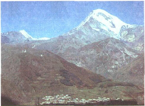Кавказ. Вид на вершину Казбек из посёлка Казбеги.