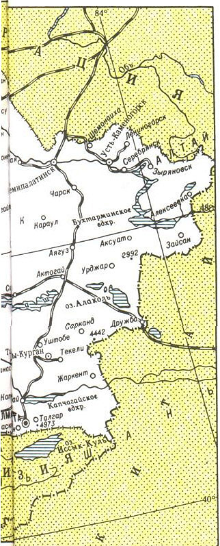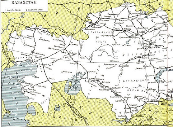 На З. - Прикаспийская низменность. На Ю.-З.- полуостров Мангышлак (впадина Карагие, 132 м ниже уровня моря). В центральной части - Казахский мелкосопочник, на С.- южная окраина Зап.-Сибирской равнины, на В. и Ю.-В.- горы Алтая, Тарбагатая, Джунгарского Алатау и Тянь-Шаня (высота до 4973 м). Климат резко континентальный. Средние температуры января от -18 °С на С. до -3 °С на Ю., июля соответственно 19 °С и 28-30 °С; осадков до 300 мм в год на С., в пустынях менее 100 мм, в горах до 1600 мм. Гл. реки - Иртыш, Урал, Чу, Сырдарья; св. 48 тыс. озёр, наиболее крупные - Каспийское и Аральское моря, Балхаш. Растительность гл. обр. степная, пустынная. Баянаульский природный национальный парк; заповедники: Алма-Атинский, Аксу-Джабаглы, Барсакельмес и др.