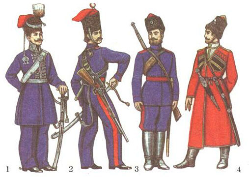 Казачество: 1 - обер-офицер лейб-гвардии Казачьего полка, 1801-09; 2 - казак Сибирского линейного казачьего войска, 1829-38; 3 - казак Уральского казачьего войска, 1885; 4 - Кубанский казак Собственного его императорского величества конвоя, 1911.