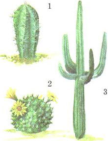 КАКТУСЫ, семейство двудольных многолетних растений. Стебли обычно мясистые, сочные, покрыты колючками или волосками, без листьев; высота от 2-5 см до 10-12 м. Древовидные, кустарниковидные и лиановидные формы. Св. 3000 видов, произрастающих гл. обр. в пустынях Америки. Цветки кактусов часто крупные, ярко окрашенные, душистые. Мякоть стеблей и ягодообразные плоды у мн. видов кактуса съедобны. Используют как топливо, в строительстве. Выращивают в комнатах и оранжереях.