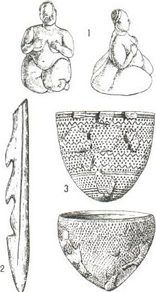Каменный век. Неолит: 1 женские статуэтки из глины; 2 - гарпун из рога; 3 - глиняная посуда с ямочным орнаментом.