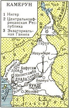 Большая часть Камеруна - плоскогорья, в центре - плато Адамауа (3008 м). На Ю.-З. - гора Камерун (4070 м). Климат на Ю. экваториальный, на С. экваториально - муссонный. Среднемесячные температуры от 22 °С на Ю. до 33 °С на С.; осадков в год от 500 мм на С. до 10000 мм (на склонах горы Камерун). Гл. река - Санага. На Ю.- тропические леса, на С.- саванны.