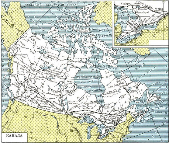 Канада занимает сев. часть Америки и примыкающие к ней острова, в т.ч. Канадский Арктический архипелаг, острова Ньюфаундленд и Ванкувер и др. Вост. часть Канады - равнины и плато высотой от 300 до 1500 м. На З.- Кордильеры высотой до 6050 м (гора Логан). Климат большей частью умеренный и субарктический. Средние температуры января от -35 °С на С. до 4 °С на Ю. Тихоокеанского побережья; июля от 21 °С на Ю. до 4 °С на островах Канадского Арктического архипелага; осадков в год от 150 мм в сев. части до 1250 мм на Атлантическом и 2500 мм на Тихоокеанском побережьях. Гл. реки - Святого Лаврентия, Макензи, Фрейзер. На Ю.-В.- система Великих озёр (Канаде принадлежит 1/3 акватории); др. крупные озёра: Большое Медвежье, Большое Невольничье, Виннипег, Атабаска. На С.- арктическая пустыня, тундра, лесотундра, на склонах Кордильер - хвойные и смешанные леса, на Ю. - степи и лесостепи, большей частью распаханные.