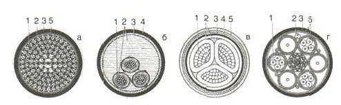 Кабель электрический. Схемы поперечных сечений некоторых типов кабелей: а - телефонного для городских телефонных сетей; б - маслонаполненного в стальном трубопроводе для передачи больших мощностей; в - силового бронированного без защитных покровов для силовых и осветительных установок; г - телевизионного для подключения передвижных телекамер к источнику питания и передающей аппаратуре; 1 - токопроводящая жила; 2 - изоляция; 3 - оболочка; 4 - наружные защитные покровы; 5 - броня, экран.