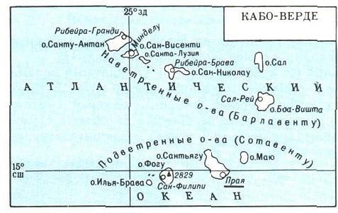 КАБО-ВЕРДЕ (Республика Кабо-Верде), государство на островах Зелёного мыса Атлантического океана, близ побережья Зап. Африки. Пл. св. 4 тыс. км2. Население 403 тыс. чел.; кабовердцы (потомки рабов, смешавшихся с португальскими переселенцами; св. 60% мулаты), фульбе, манджак, баланте и др. Официальный язык - португальский. 98% населения - католики. Глава государства - президент. Законодательный орган - однопалатный парламент (Национальное народное собрание). Столица - Прая. Адм.-терр. деление: 14 округов. Денежная единица - эскудо Кабо-Верде.