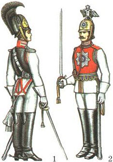 Кавалергарды: 1 - оберофицер, 1820-е гг.; 2 - рядовой в дворцовой форме, конец 19 - начало 20 вв.