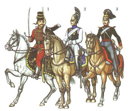 Кавалерия: 1 - рядовой Острогожского гусарского полка, 1763-76; 2 - рядовой Стародубского кирасирского полка, 1813-14; 3 - рядовой Казанского драгунского полка, 1851-55.