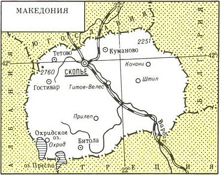 МАКЕДОНИЯ (Республика Македония), государство на Ю. Европы, на Балканском полуострове, в долине реки Вардар. Пл. 25,7 тыс. км2. Население 1,97 млн. чел.; македонцы, албанцы, турки, цыгане, сербы, боснийцы и др. Официальный язык - македонский. Верующие преимущественно христиане и мусульмане. Глава государства - президент. Законодательный орган - парламент (Собрание). Столица - Скопье. Адм.-терр. деление: 30 р-нов. Денежная единица - денар.