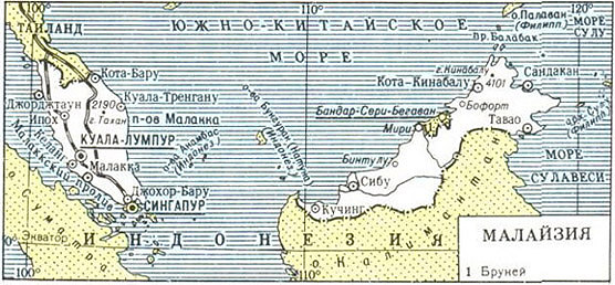 МАЛАЙЗИЯ, государство в Юго-Вост. Азии; состоит из разделённых Южно-Китайским морем частей: Западная Малайзия (Малайя) - на полуострове Малакка, Восточная Малайзия - в сев.-зап. части острова Калимантан; омывается водами Южно-Китайского моря, морей Сулу и Сулавеси. Пл. 332,8 тыс. км2. Население 20,4 млн. чел.; малайцы (55%), китайцы (34%), индийцы (10%). Официальный язык - малайский. Государственная религия - ислам. Малайзия - конституционная монархия. Глава государства избирается поочерёдно главами образующих федерацию султанатов на 5 лет. Законодательный орган - двухпалатный парламент (Сенат и Палата представителей). Столица - Куала-Лумпур. Малайзия - федерация в составе 13 штатов-султанатов и 2 федеральных территорий. Денежная единица - ринггит (малайзийский доллар).