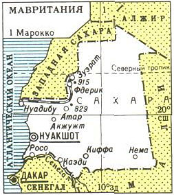 Территория Мавритании в осн. пустыня. Климат тропический пустынный. Средние температуры января 16-20 оС, июля 30-32 оС; осадков 100-400 мм в год.