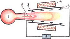 Магнитогидродинамический генератор (простейшая схема): 1 - источник ионизованного газа; 2 - ионизованный газ; 3 - канал, по которому подаётся плазма; 4 - электромагнит; 5 - электроды; 6 - нагрузка.