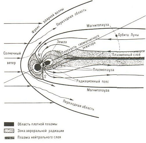 МАГНИТОСФЕРА Земли и планет, область околопланетного пространства, физические свойства которой определяются магнитным полем планеты и его взаимодействием с потоками заряженных частиц космического происхождения (с солнечным ветром). Магнитосфера Земли с дневной стороны простирается до 8-14 RO (RO - земной радиус), с ночной - вытянута, образуя т.н. магнитный хвост Земли в несколько сотен RO; в магнитосфере находятся радиационные пояса. Магнитосфера Земли является своеобразным экраном, защищающим планету от губительных для жизни потоков солнечного ветра. Протяжёнными магнитосферами обладают Юпитер и Сатурн. Магнитосферы Меркурия, Венеры, Марса ярко не выражены.