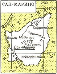 САН-МАРИНО (Республика Сан-Марино), государство в Юж. Европе, на Апеннинском полуострове, в 13 км от Адриатического моря. Окружено территорией Италии (анклав). Пл. 61 км2. Население 25,3 тыс. чел.; сан-маринцы (80%), итальянцы (ок. 18%). Официальный язык - итальянский. Верующие преимущественно католики. Законодательный орган - выборный Большой генеральный совет. Исполнительную власть возглавляют 2 капитана-регента, назначаемых Большим советом на 6 месяцев. Столица - Сан-Марино. Адм.-терр. деление: 9 округов (замков). Денежная единица - итальянская лира.