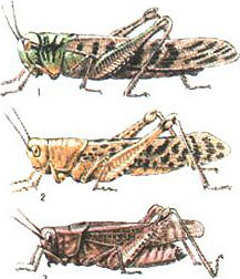 Саранча (саранчовые): 1 - перелётная; 2 - пустынная; 3 - итальянский прус.