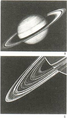 Сатурн: а - общий вид; б - кольца Сатурна, состоящие из сотен тонких колечек, образованных вращающимися вокруг планеты частицами (в основном льда) размером от 1 см до 5 м.