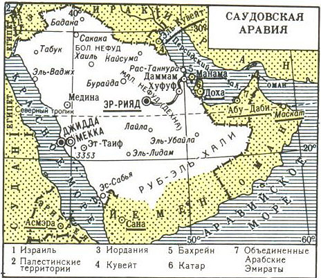 САУДОВСКАЯ АРАВИЯ (Королевство Саудовская Аравия), государство на Ю.-З. Азии, занимает 2/3 Аравийского полуострова и ряд прибрежных островов в Красном море и Персидском заливе. Пл. 2,15 млн. км2 (границы Саудовской Аравии на Ю. и Ю.-В. проходят по пустыням и чётко не определены). Население 18,4 млн. чел., в осн. саудовцы (арабы Саудовской Аравии). Официальный язык - арабский. Государственная религия - ислам. Монархия во главе с эмиром. Столица - Эр-Рияд. Адм.-терр. деление: 13 адм. р-нов. Денежная единица - риал Саудовской Аравии.