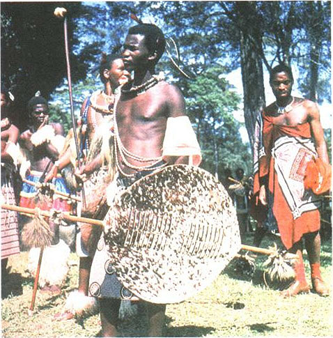 Свазиленд. Свази в традиционных одеждах воинов.