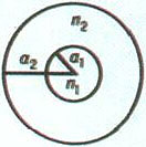 Световод. Поперечное сечение волоконного световода: а1, а2 - радиусы; n1, n2 - показатели преломления; n1 > n2.