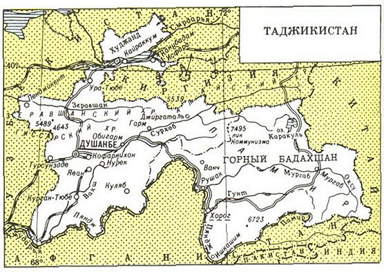 Св. 90% территории занимают горы, относящиеся к системам Памира (высота до 7495 м; пик Коммунизма), Гиссаро-Алая и Тянь-Шаня, разделённые межгорными котловинами и долинами (Ферганская, Зеравшанская, Гиссарская и др.). Климат резко континентальный. В долинах и на равнинах (до высоты 500 м) средние температуры января от -1 °С на С. до 3 °С на Ю., июля от 27 °С на С. до 30 °С на Ю.; осадков 150-300 мм в год. На высоте 500-1500 м средние температуры января -20 °С, июля 10-12 oС; осадков 1200-2000 мм в год. Крупные ледники - Федченко, Зеравшанский и др. Гл. реки - Сырдарья, Амударья, Зеравшан; крупное озеро - Каракуль; крупные оросительные каналы - Гиссарский, Дальверзинский, таджикская часть Большого Ферганского и Северного Ферганского. Растительность пустынная, степная, высокогорно-луговая. Заповедники: Тигровая Балка, Ромит и Даштиджумский.