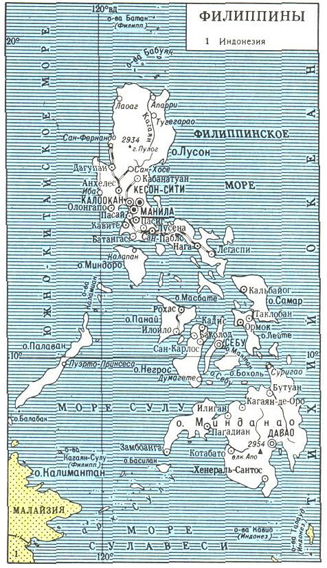 ФИЛИППИНЫ (Республика Филиппины), государство в Юго-Восточной Азии, на Филиппинских островах в Тихом океане. Пл. ок. 300 тыс. км2. Население 71,8 млн. чел., св. 80% - тагалы, бисайя, илоки и др. Официальные языки - пилипино (на базе тагальского) и английский. Большинство верующих - католики. Глава государства и правительства - президент. Законодательный орган - двухпалатный парламент (Сенат и Палата представителей). Столица - Манила. Адм.-терр. деление: 13 областей и 2 автономные области. Денежная единица - филиппинское песо.