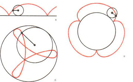 Циклоида: а - циклоида; б - гипоциклоида; в - эпициклоида.