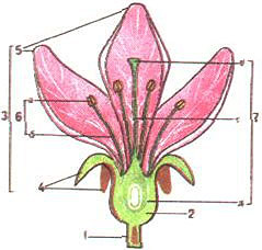 Цветок. Схема строения: 1 - цветоножка; 2 - цветоложе; 3 - околоцветник; 4 - чашелистики; 5 - лепестки; 6 - тычинки (а - пыльник, б - тычиночная нить); 7 - пестик (в - рыльце, г - столбик, д - завязь).