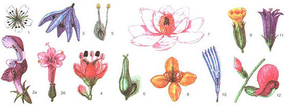 Цветок. Различные типы цветка. С двойным околоцветником: 1 - правильный (звездчатка); 2 - неправильный (2а - яснотка, 2б - валериана). С простым околоцветником: 3 - венчиковидный (пролеска); 4 - чашечковидный (ильм). Без околоцветника (ива): 5 - тычиночный; 6 - пестичный. С раздельнолепестным венчиком: 7 - магнолия; 8 чистотел. Со спайнолепестным венчиком: 9 - первоцвет; 10 - цикорий; 11 - колокольчик. С мотыльковым венчиком: 12 -чина.