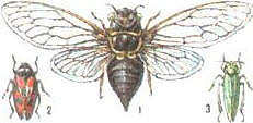 Цикады: 1 - обыкновенная цикада; 2 - красно-пятнистая цикадка; 3 - зелёная цикадка.