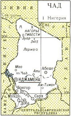 Большая часть территории - равнина; на С.- нагорье Тибести (высота до 3415 м). Климат на С. тропический пустынный, на Ю. субэкваториальный. Среднемесячные температуры от 15 до 35 °С; осадков от 100 до 1000 мм в год. Гл. судоходная река - Шари; озеро Чад. Пустыни на С., саванны на Ю.