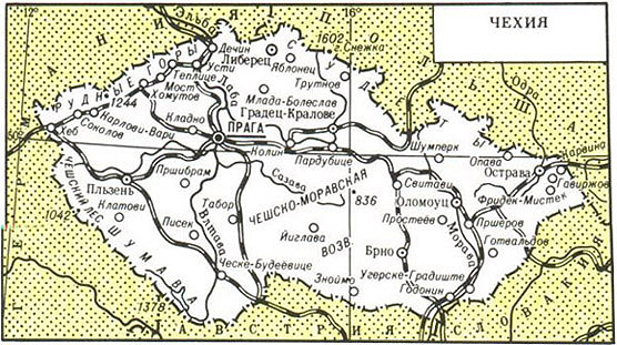 Большая часть территории находится в пределах Чешского массива, по окраинам которого расположены средневысотные хребты Чешский Леси Шумава (на Ю.-З.), Рудные горы (на С.-З.), Крконоше (на С.-В.; наивысшая точка - 1602 м, гора Снежка). Во внутренней части массива - т.н. Чешская котловина, состоящая из ряда низменностей, разделённых низкогорными массивами. На Ю. и в центральной части - Чешско-Моравская возвышенность. Климат умеренный. Средние температуры января от -1-4 °С на равнинах до -10 °С в горах, июля соответственно от 19-21 до 4-8 oС; осадков от 450-600 мм в год на равнинах до 1200-1600 мм в горах. Гл. реки: Лаба, Влтава. По склонам гор - смешанные и хвойные леса.