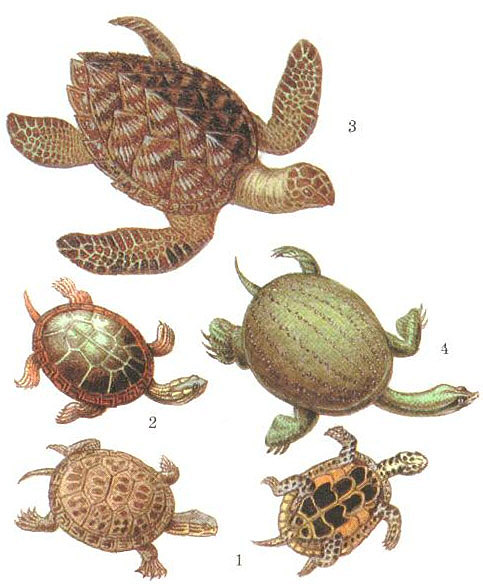 Черепахи: 1 - китайская (справа - вид снизу); 2 - украшенная; 3 - морская (бисса); 4 - дальневосточная.