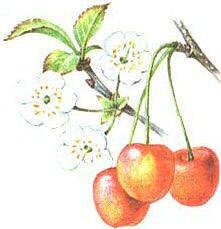 Черешня. Плоды и побег с цветками.