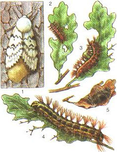 Шелкопряды. Непарный шелкопряд: 1 - самка, откладывающая яйца; 2-4 - гусеницы разных возрастов, поедающие листья дуба; 5 -куколка.