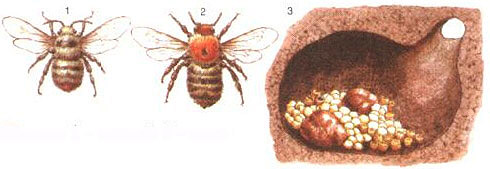 Шмели: 1 - лесной; 2 - полевой; 3 - гнездо шмелей.