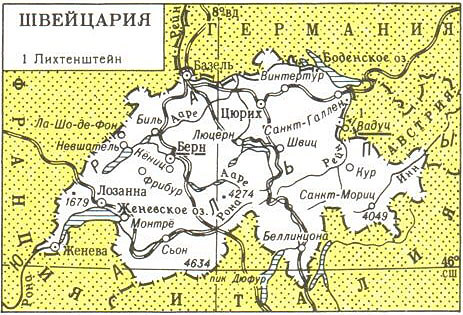 Швейцария - горная страна, св. 60% территории занимают Альпы (высота до 4634 м, пик Дюфур); в центре - Швейцарское плоскогорье с многочисленными озёрами, на С.-З.- горы Юра (высота в Швейцарии до 1679 м). Климат умеренно влажный, в горах холодный. Средние температуры на плоскогорье (Женева) января ок. О °С, июля 19 °С; осадков 800-2500 мм в год. Реки (главные - Рейн и Рона) порожистые, многоводные. Крупные озёра: Боденское, Женевское, Лаго-Маджоре. В Альпах - ледники. Леса (26% территории), субальпийские и альпийские луга.