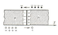 переход (схема): чёрные точки - электроны; светлые - дырки (х - координата).