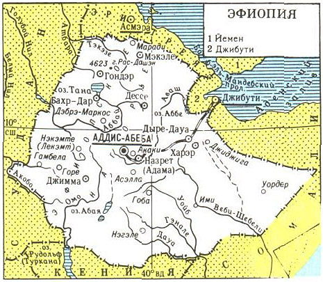 Большую часть территории занимает Эфиопское нагорье (высота до 4623 м, гора Рас-Дашэн); на С.-В.- впадина Афар, на Ю.-В.- Эфиопско-Сомалийское плато. Омывается Красным морем. Климат тропический пустынный и полупустынный на С.-В., субэкваториальный - в остальной части. Среднемесячные температуры 13-18 °С (Аддис-Абеба); осадков от 150-600 до 1500-1800 (местами менее 50) мм в год. Крупные реки: Голубой Нил, Аваш, Веби-Шебели. Кустарникoвые пустыни и полупустыни, опустыненные саванны в северной, восточной и южной частях; в юго-западной части - влажные тропические леса.