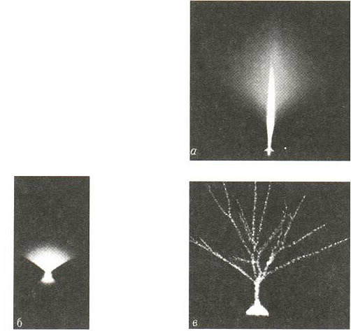 Электрический разряд в газах. Кистеобразные формы коронного разряда в атмосфере (а, б, в); примерно такое же свечение, как на рис. б, можно наблюдать около высоковольтных проводов.