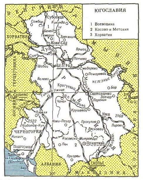 В 1918 образовано Королевство сербов, хорватов и словенцев (с 1929 - Югославия), включавшее Сербию, Хорватию, Словению, Боснию и Герцеговину, Македонию, Черногорию. В апреле 1941 на Югославию напали немецкие войска, оккупировавшие и расчленившие территорию страны. В Югославии развернулась Народно-освободительная война. Сев.-вост. часть страны была освобождена в 1944 в ходе совместных действий народно-освободительной армии Югославии и советских войск. В мае 1945 югославская армия завершила освобождение Югославии. С 1945 Югославия - федеративная республика (с 1963 - Социалистическая Федеративная Республика Югославия - СФРЮ), у власти находилась югославская КП. Было провозглашено создание югославской модели социалистического общества на основе самоуправления. С 1980-х гг. нарастали экономические и политические трудности. В 1991 с обострением межнациональных противоречий СФРЮ распалась. Из её состава вышли Хорватия, Словения, Босния и Герцеговина, Македония. В 1992 Сербия и Черногория образовали Союзную Республику Югославию.