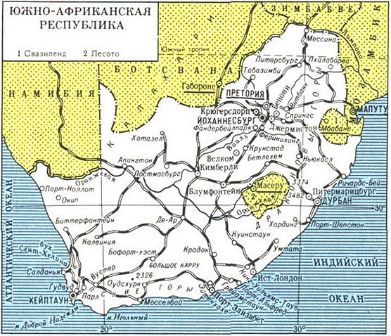 ЮЖНО-АФРИКАНСКАЯ РЕСПУБЛИКА, государство на Ю. Африки. Омывается Атлантическим и Индийским океанами. Пл. 1,2 млн. км2. Население 41,7 млн. чел., в т.ч. африканцы (76%; зулу, коса и др.), метисы (9%), выходцы из Европы (ок. 13%), гл. обр. африканеры (буры) и южно-африканцы. Официальные языки - африкаанс и английский. Верующие - христиане (гл. обр. протестанты), часть придерживается местных традиционных верований; мусульмане, индуисты. Входит в Содружество. Глава государства - президент. Законодательный орган - двухпалатный парламент (Сенат и Национальное собрание). Столица - Претория, резиденция парламента - Кейптаун. Административно-территориальное деление: 9 провинций. Денежная единица - рэнд.