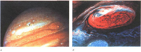 Юпитер: а - верхний слой облаков состоит в основном из кристаллов аммиака; б - большое красное пятно - гигантский устойчивый антициклон.