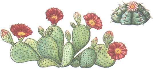 Существуют дюжины разных кактусов, но все они имеют одну общую черту: кактусы растут в жарком, пустынном климате. Способность к этому они имеют потому, что хранят воду в своих толстых стеблях. Растения эти покрыты колючками, защищающими запас воды от пустынных животных.