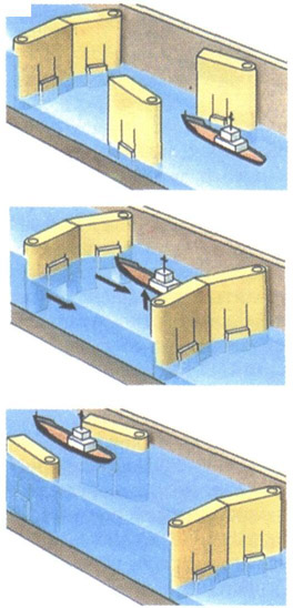 в шлюзе и за ним выравниваются, ворота открывают, и корабль может проследовать