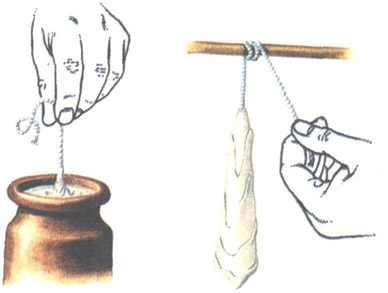 Фитиль самодельной свечи много раз опускают в сосуд с расплавленным воском. Свечи можно также изготовлять отливкой в формы.