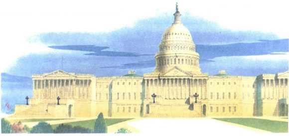 Капитолий, здание Конгресса Соединенных Штатов, вмещает зал заседаний Сената (в северном крыле) и Палату представителей (в южном крыле). На верху купола установлена шестиметровая бронзовая статуя Свободы.