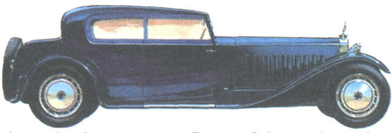 Автомобиль для миллионеров "Бугатти Ройял", их было выпущено всего шесть с 1927 по 1933 гг. Объем восьми цилиндров его двигателя составлял 12,8 л. Вес машины превышал 2,5 т.