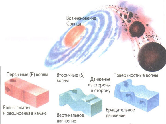 Вверху: из центра землетрясения исходят волны трех видов: р-волны (продольные), s-волны (поперечные) и поверхностные волны.