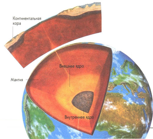 Под земной корой находятся мантия. внешнее и внутреннее ядро.